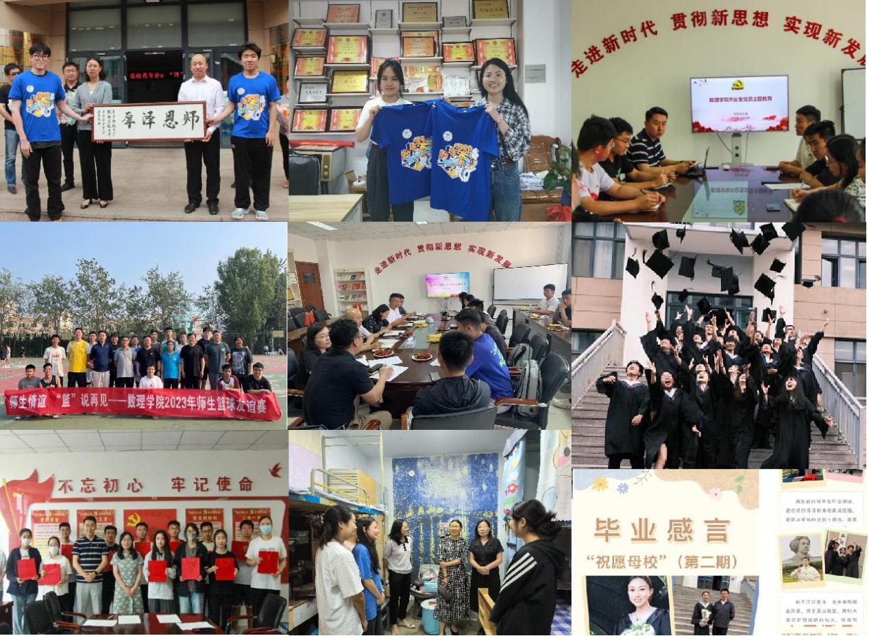 数理学院团委开展“感恩奋进新时代 逐梦奋斗新征程”毕业生系列活动,营造积极、温馨、和谐的离校氛围。赠送毕业礼物;为每位毕业生精心设计文化衫,表达对毕业生的深切厚望和无限期待。举办毕业生座谈会;听取毕业生的意见建议,共话离别之情,共望未来发展。开展师生篮球赛;以篮球之名,为毕业生送行,进一步增进师生友谊,留下美好而珍贵的回忆。征集“祝愿母校”感言;引导毕业生把最淳朴、最真挚、最美好的祝愿献给母校。开展毕业生党员主题教育;上“最后一次党课”、分享一次初心感悟、作出一份庄重的承诺,在思想洗礼中汲取奋进力量。走访毕业生宿舍;为毕业生送去祝福和温暖,勉励毕业生弘扬“科大家风”,践行“橡胶品格”,将数理人的严谨、笃学、钻研精神传承下去。
