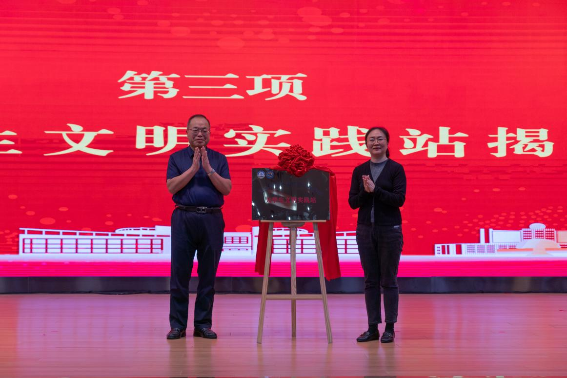 仪式上,丁林与机电工程学院院长何燕共同为学院大学生文明实践站揭牌。