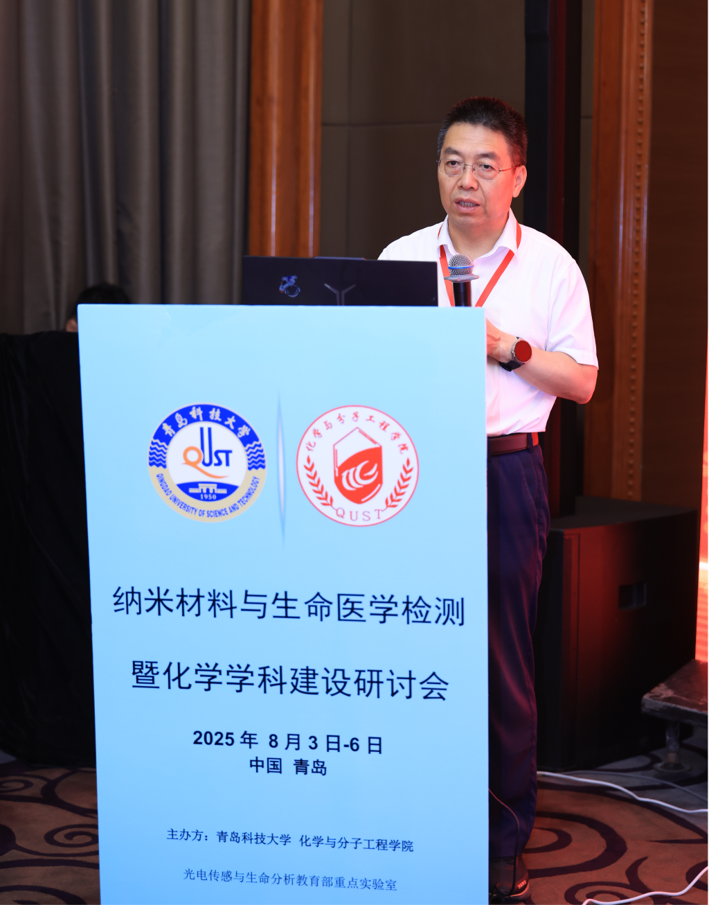 8月4-5日,纳米材料与生命医学检测暨化学学科建设研讨会在青岛召开。国家杰青、苏州大学生命科学学院院长高明远教授,国家万人计划领军人才、山西省科协副主席、山西省人民医院党委书记张瑞平教授,国家杰青、化工资源有效利用国家重点实验室主任宋宇飞教授等20余位知名专家学者应邀参加会议并作学术报告。金沙集团1862cc党委常委、副校长吕万翔出席会议并致辞。光电传感与生命分析教育部重点实验室主任丁彩凤主持开幕式。