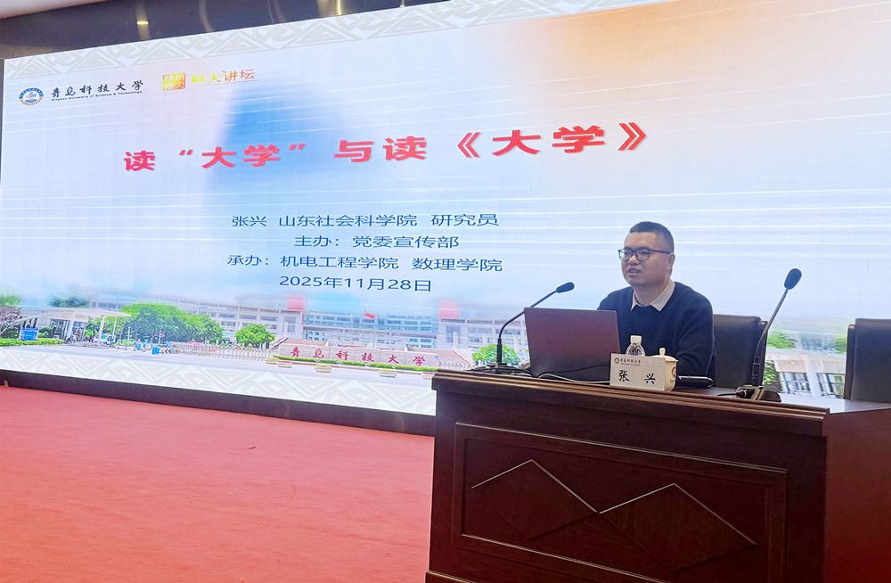 11月28日下午,由党委宣传部主办,机电工程学院、数理学院承办的“科大讲坛”在崂山校区第三报告厅举行。山东社会科学院国际儒学研究院研究员、山东省泰山学者青年专家张兴应邀作了题为“读‘大学’与读《大学》”的专题讲座。