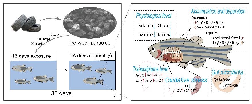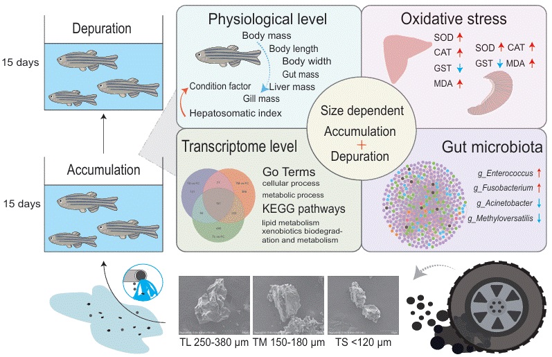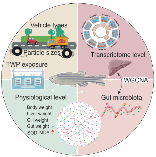 轮胎磨损颗粒(Tire Wear Particles, TWPs)是交通活动产生的重要微塑料污染物,广泛存在于土壤、水体和大气中,对水生生态系统的潜在威胁日益受到关注。然而,不同粒径、来源及浓度的TWPs在生物体内的毒理作用机制仍不清晰。为系统揭示TWPs的毒性规律及其对宿主与肠道微生物互作的影响,金沙集团1862cc生物工程学院丛静副教授指导张云、赵天宇、宋倩倩、孟庆轩等研究生,开展了一系列系统研究,并取得重要进展。