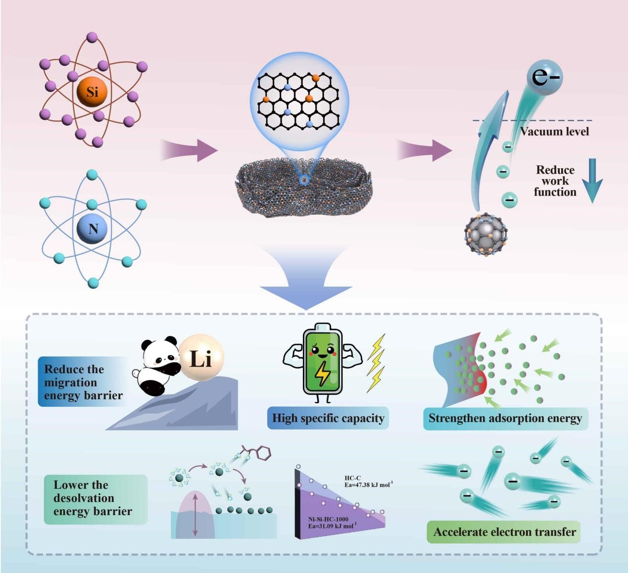 近日,金沙集团1862cc朱晓东/木天胜团队在《Advanced Functional Materials》期刊上发表了题为“Tailored Work Function by N, Si Co-Doping Enables High-Performance Hard Carbon Anode for Lithium-lon Batteries”的研究论文(中科院一区,影响因子:19)。化工学院研究生宋佳瑶为论文第一作者,朱晓东教授、木天胜副教授为论文共同通讯作者。