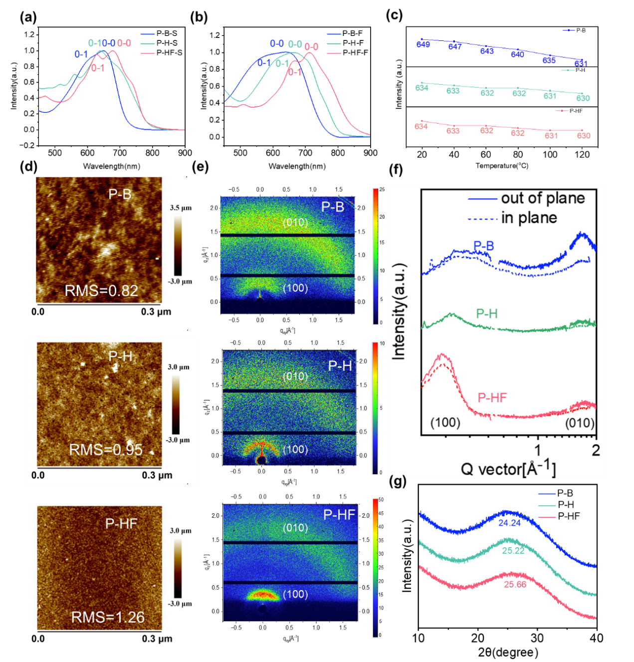 通过对三种聚合物的两个重复单元的度泛函理论计算(图3),可以发现与P-B相比,其他两种聚合物具有显著提升的平面性,而经过R-F处理后的重复单元表现出几乎完全共平面的主链结构。此外,这三种材料的静电势计算显示,由于引入了亚乙烯基的正电位, P-HF的正负电荷边界清晰。在三种聚合物中,由于直接的D-A效应以及融合DPP单元内的平面结构,P-HF的推拉效应最强,表现出显著增大的DPP和IDT之间的电负性范围,有利于增强分子间的静电相互作用。这些计算证实了协同作用有助于形成具有高平面主链的共轭聚合物,增强分子间的作用力并强化ICT效应