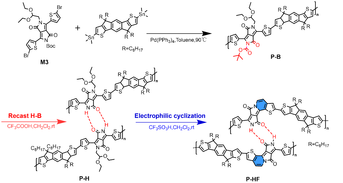 具有高电荷传输迁移率的有机半导体材料,因其可通过溶液加工的方法构筑柔性、大面积、高性能的有机光电薄膜器件而受到越来越多的关注。然而,有机材料的电荷传输迁移率仍落后于无机材料。因此,开发一种简单且广泛适用的高电荷迁移率的分子设计概念是非常重要的。如图1所示,该工作将具有良好的平面性、优异的稳定性、结构可修饰性吡咯并吡咯二酮(DPP)分别与氢键(H-B)和环融合(R-F)结构进行整合,得到了三种新型聚合物半导体聚合物材料P-B,P-H和P-HF,系统地研究了H-B与R-F的协同作用对DPP基有机半导体电荷传输能力的影响。