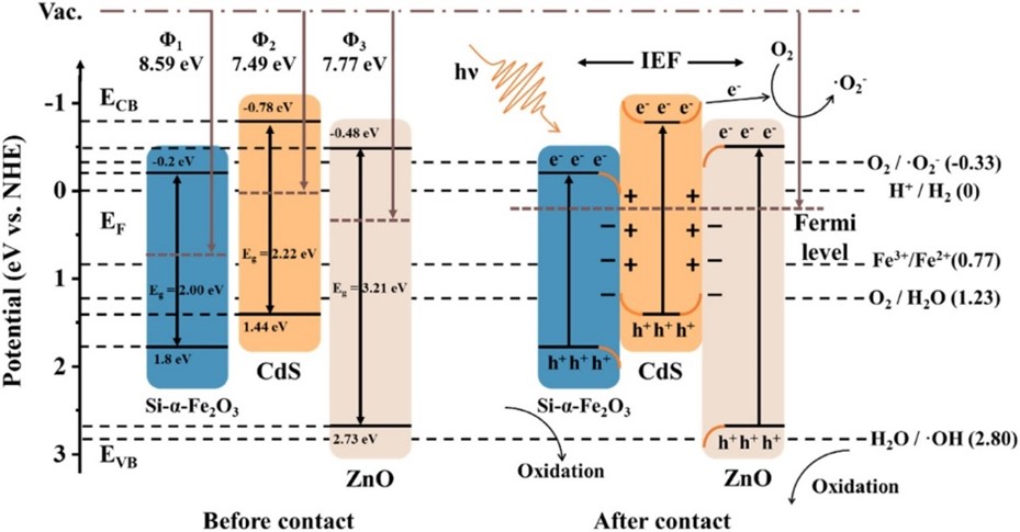 因费米能级差异,电子自发转移形成内建电场;可见光激发后,内建电场与能带弯曲驱动无效电子-空穴对复合,同时保留了CdS导带中具有强还原能力的电子与Si-α-Fe2O3/ZnO价带中具有强氧化能力的空穴。得益于双S型电荷传输路径,该催化剂显著加速了Fe3+/Fe2+循环,光生载流子分离效率大幅提升。本工作不仅为抗生素废水高级氧化处理提供了高效、绿色的新策略,也为设计双S型异质结开辟了新路径。