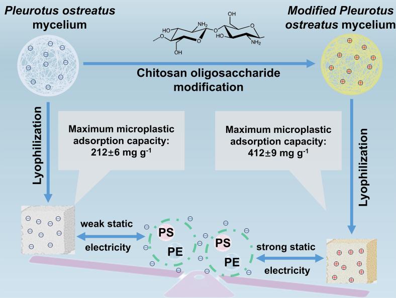 针对水中微塑料的治理难题,团队创新性地提出了一种基于改性可食用真菌平菇的去除方法,选用绿色可食、经济易得的平菇菌丝体构建微塑料去除框架,以天然物质壳聚糖和柠檬酸对其改性,得到改性菌丝体(M-PM)海绵。1 g M-PM可去除412.42±9.14 mg MPs,常温下,其对自来水样品中MPs的去除率高达68.8%,对其他水样的去除率也可达60.1%~67.4%。该材料的优异性能主要源于内部的结构交联与表面的阳离子化修饰。此外,M-PM具备良好的生物相容性,整个制备和使用过程绿色无污染。相关研究成果以题为《Chitosan oligosaccharide-modified Pleurotus ostreatus mycelium for microplastic removal based on the green design concept》的论文,发表于国际期刊《Industrial Crops and Products》(JCR一区,IF=6.2)。论文第一作者为生物工程学院硕士研究生董新睿,金沙集团1862cc为第一单位,通讯作者为王霞副教授。