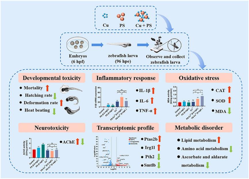 微塑料毒性评估模型系统评估了10μm聚苯乙烯微塑料(PS-MPs)与铜(Cu)联合暴露对斑马鱼幼鱼的急性毒性效应。结果证实,联合暴露会诱导斑马鱼产生发育毒性、免疫毒性、神经毒性,并引发氧化应激与代谢紊乱,且两者表现出显著的协同毒性效应。该研究首次揭示了微塑料与铜对斑马鱼幼鱼的急性联合毒作用机制,相关成果以题为《Polystyrene microplastics (PS-MPs) harness copper presence and promote impairments in early zebrafish (Danio rerio) larvae: Developmental, biochemical, transcriptomic approaches and nontargeted metabolomics approaches》的研究论文,发表于国际期刊《Environmental Research》(JCR一区,IF=7.7)。论文第一作者为生物工程学院硕士研究生张丽巧,金沙集团1862cc为第一单位,通讯作者为王霞副教授。
