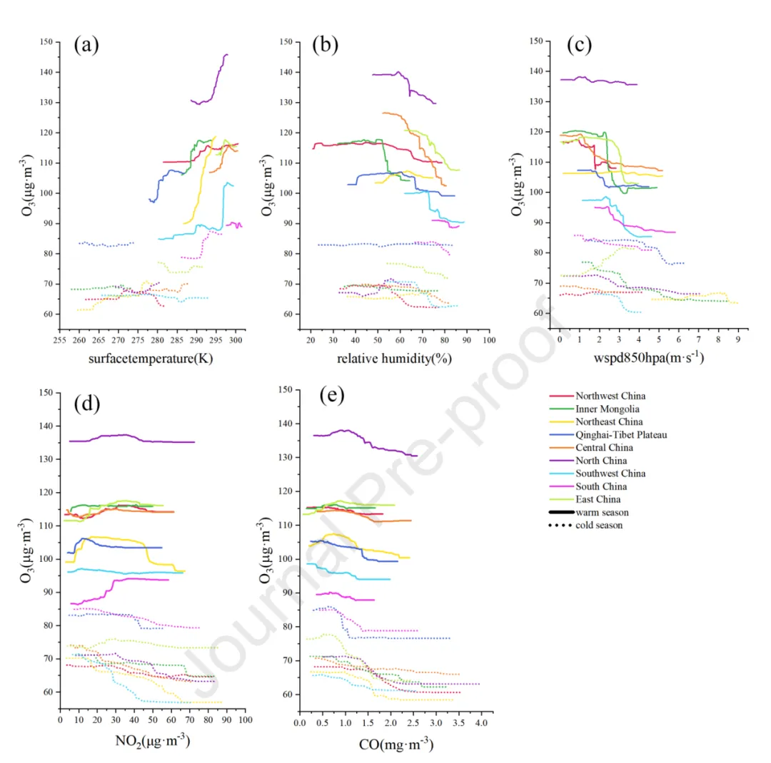 研究结合全国1497个站点的监测数据、ERA5再分析场及社会经济格网数据,引入Random Forest(随机森林)与PDP可解释机器学习方法,克服传统化学传输模型计算量大、参数依赖性强的痛点。研究证实,我国臭氧呈“南增北高”特征,暖季主要受温度、湿度与高空风速共同驱动(贡献率逾50%),而冷季对CO、NO₂的响应显著增强。该研究首次揭示了中国臭氧浓度的“高温抑制”现象及湿度关键阈值,相关成果以题为《Meteorological and Socioeconomic Impacts on China Ozone Past and Future Analysis》的研究论文,发表于Cell Press细胞出版社旗下交叉学科权威期刊《iScience》(JCR一区,IF=8.0)。金沙集团1862cc为第一单位,王晓红副教授为通讯作者。