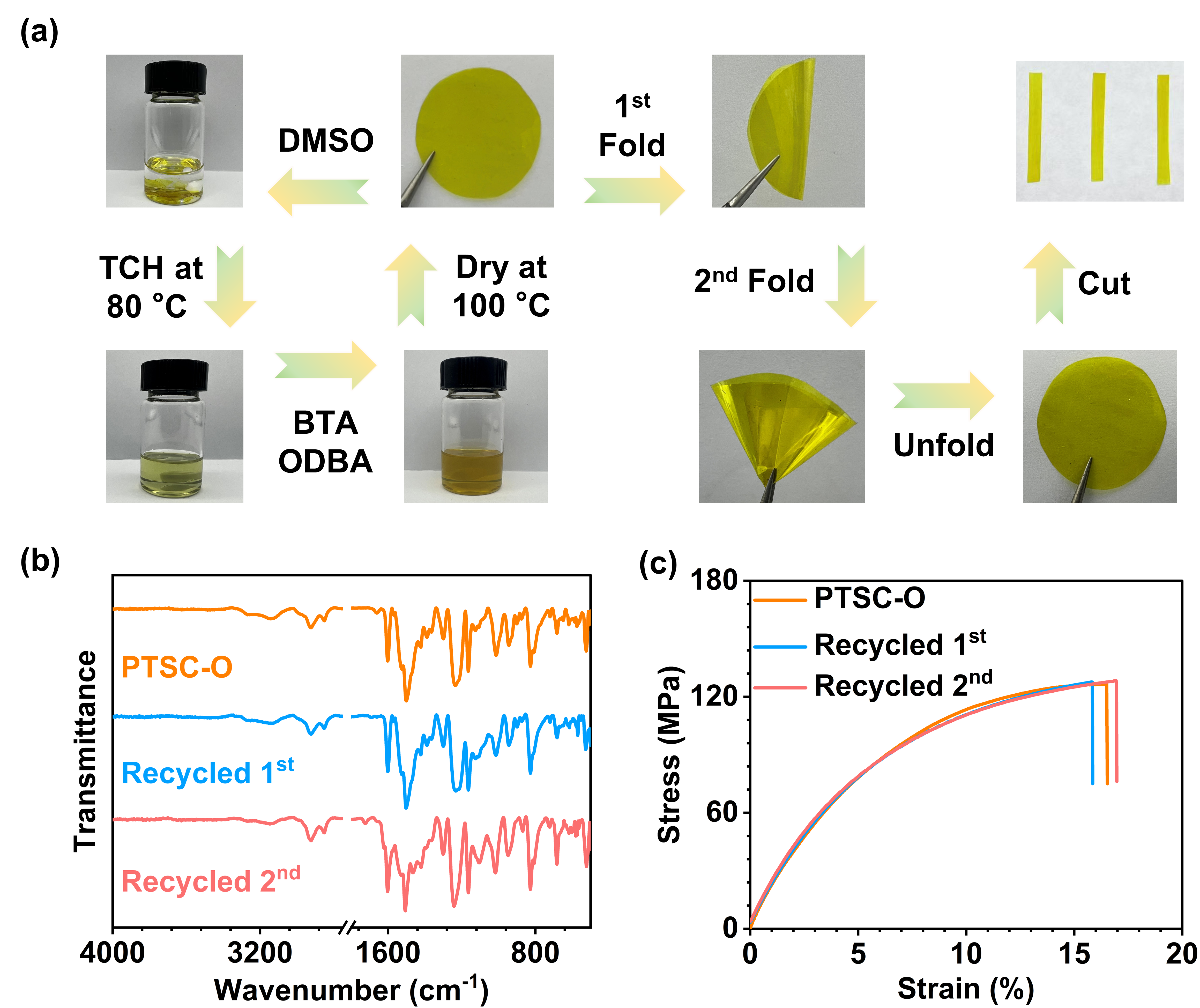 图3.(a)照片展示了PTSC-O在含TCH的DMSO溶液中处理15 min后解聚为可溶性寡聚物的过程。随后向该寡聚物溶液中加入新鲜醛单体即可实现再成膜。所得回收树脂保留了与原始材料相当的性能,可实现与初始样品相同的折叠与展开行为,其FTIR光谱(b)及应力–应变曲线(c)均与原始树脂高度一致。