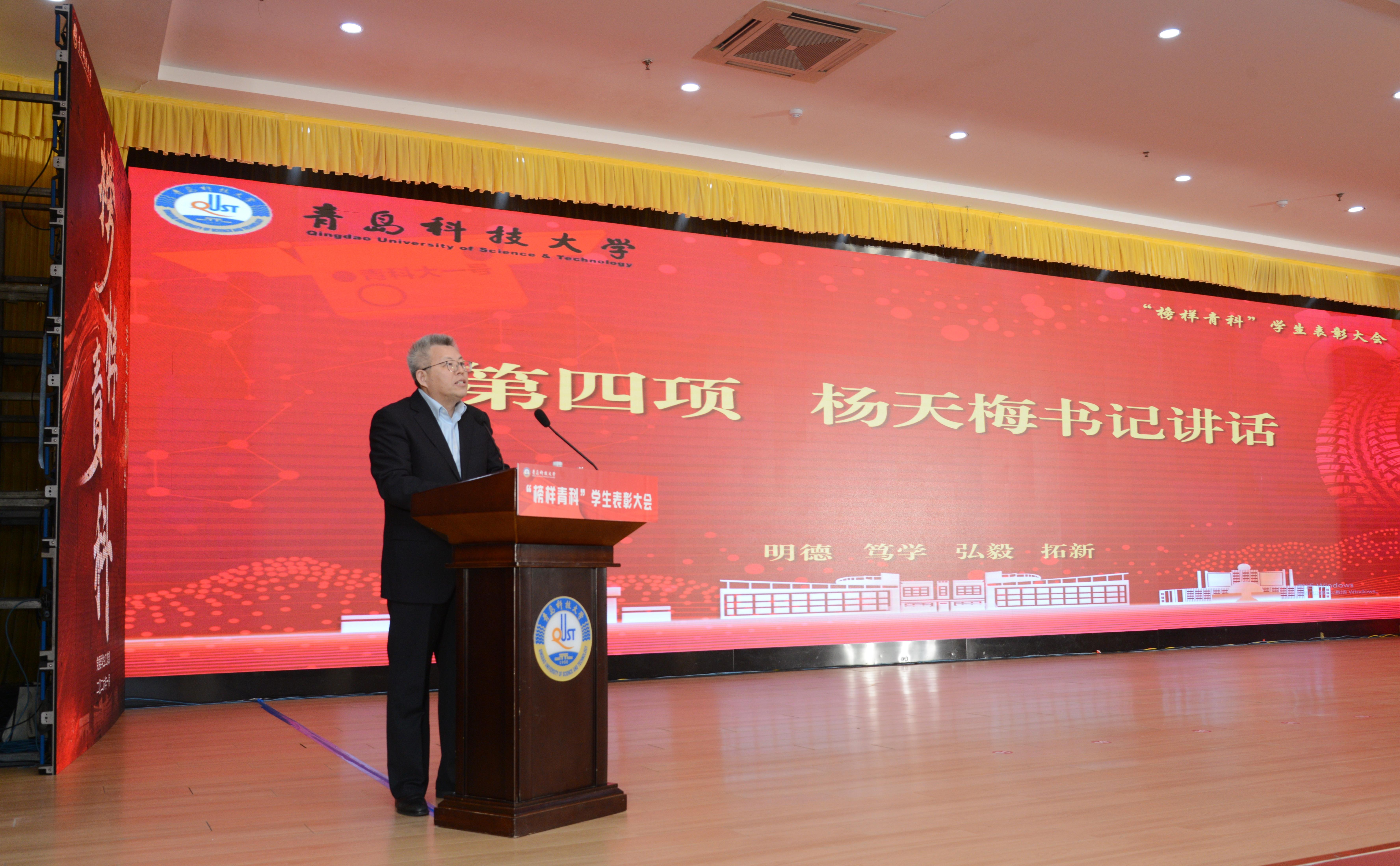 大会在庄严的国歌声中拉开帷幕。党委书记杨天梅向受到表彰的优秀集体和先进个人表示祝贺,结合5位杰出校友的奋斗成长历程,向全体青科大学子发出“接续奋斗”的号召,并寄予四点殷切希望:一是坚定理想信念、筑牢精神根基,做胸怀家国的追梦者。新时代青年肩负实现民族复兴的历史重任,要将个人的理想追求主动融入国家发展和民族振兴的时代洪流之中。二是合理规划发展,练就过硬本领,做知行合一的奋斗者。既要仰望星空,树立长远目标;也要脚踏实地,为自己设定合理目标。既要珍惜课堂时光,在专业领域求精求深;也要主动打破学科壁垒,构建融会贯通的知识体系;更要勇敢走出舒适区,积极投身科技创新最前沿、社会实践大课堂和志愿服务广阔天地。三是加强品德修养,锤炼高尚人格,做崇德向善的示范者。要将修身立德置于更加重要位置,从爱党爱国、孝敬父母、勤勉劳作等事情做起,自觉涵养政治大德、社会公德、家庭美德、个人品德。学生骨干要带头践行文明规范,凝聚和带动身边同学,共同塑造健康向上、风清气正的校园生态。四是做到爱校荣校,传承科大文化,做青科大故事的传播者。要主动了解学校不平凡的创业史与砥砺奋进的发展史,自觉成为“科大精神”的发扬者、“橡胶品格”的践行者,讲好“科大故事”,始终以主人翁姿态积极主动投身学校建设、服务社会发展。
